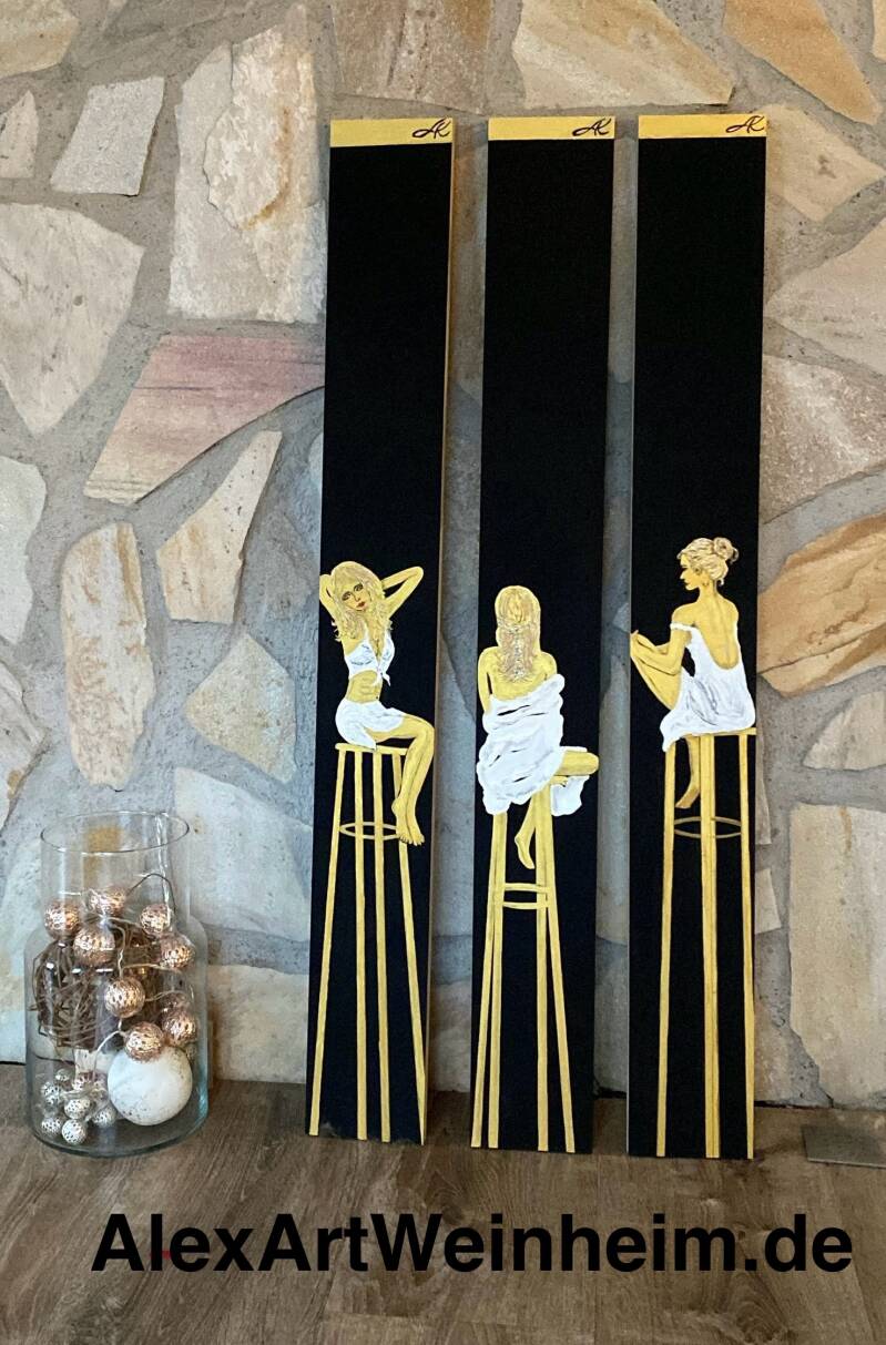 Triptychon aus Holz bemalt mit Acryl, Spachtel und Goldfarbene.